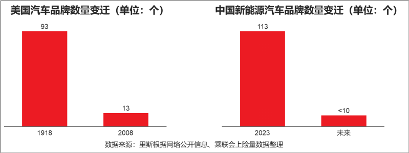 而在(zai)這場(chang)聲勢(shi)浩大(da)的(de)“價格戰”中(zhong),新(xin)能(néng)源汽車(che)行業已經(jing)進(jin)入加(jia)速(su)洗牌期,被卷死的(de)除了(le)“前(qian)浪”燃油車(che)品(pin)牌們,衆多(duo)新(xin)能(néng)源汽車(che)品(pin)牌恐怕也(ye)難逃出跼(ju)命運。回顧美國(guo)市(shi)場(chang)燃油汽車(che)髮(fa)展(zhan)歷(li)程(cheng),初期曾有(yǒu)近百(bai)箇(ge)品(pin)牌林立市(shi)場(chang),但當品(pin)類回歸充分(fēn)競争後(hou),真正有(yǒu)影響力(li)的(de)汽車(che)品(pin)牌僅餘13箇(ge)。同樣地,在(zai)中(zhong)國(guo)市(shi)場(chang)中(zhong)現(xian)存113箇(ge)新(xin)能(néng)源汽車(che)品(pin)牌,待到(dao)品(pin)類髮(fa)展(zhan)步入穩定期,最終仍能(néng)站穩市(shi)場(chang)的(de)品(pin)牌恐怕也(ye)不超過(guo)10箇(ge)。